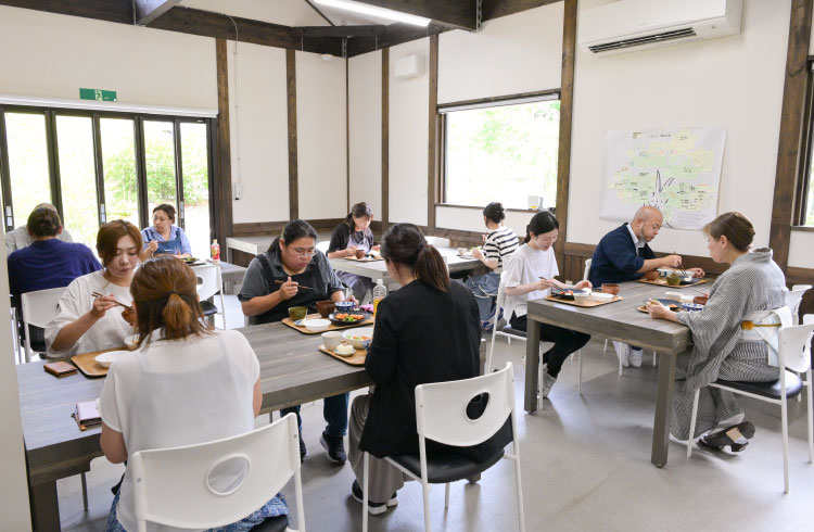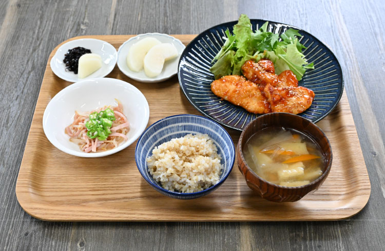 力を入れている取り組みの一つが「食」です。東日本大震災で被災し、復旧作業中に食事を共にする大切さを体験したことを踏まえ、2021年に本社を新築した際に社員食堂を開設。栄養バランスを重視した食事を提供しています。ご飯は白米と玄米から選択でき、出汁にこだわったヘルシーで家庭的なメニューが好評。食事づくりには、専任の調理担当のほかに、社員が当番制で業務時間内に参加。健康的な食材や調理について学ぶ機会となっています。